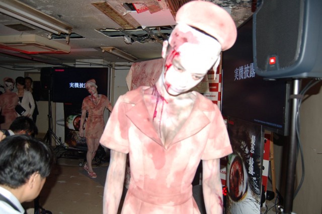 モチーフの『サイレントヒル』は、ハリウッド映画にもなったほどの大人気コンテンツ。木曽原社長の挨拶が終わると早速『サイレントヒル』(ネットスラングではサイレント=静 ヒル=丘・岡)シリーズのお馴染みのセクシーキャラクター「バブルヘッドナース」によるナースのお仕事的なアンヴェールが行われ、続けざまに背筋が寒くなる恐怖のプロモーションムーヴィーが放映されと、冷や汗をかく羽目に・・・。
