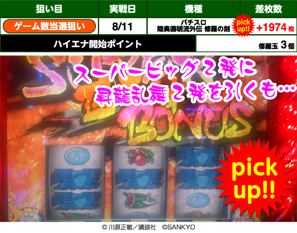 とりあえず初当りはゲーム数解除(玉なんていらんかったんや)、そこからスーパービッグ2発に昇龍乱舞2発を引くも、記憶にすら残ってないレベルの上乗せしか得られず…。それでも2000枚を軽く超える出玉を獲得。波に乗ったらグイグイ増えるねこれ、一瞬だけど閉店終了を覚悟したもん。終了後も玉が4つあったので打ち続け、CZをスルーしたところで終了です。