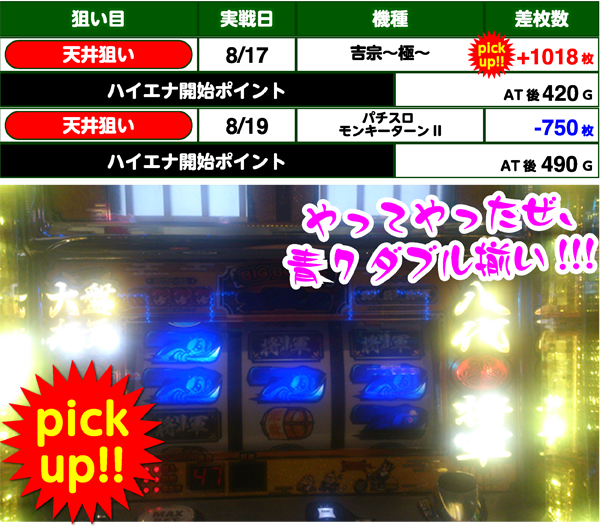 再び天国で手にした3度目のビッグでついにやってやったぜ、青7ダブル揃い。これでATとビッグの1G連が確定。投資が約800枚。AT突入前で、すでに持ち玉が600枚近くあったのでこの時点でほぼプラスが確定。あとは、大盤振舞極とかちょこちょこと上乗せを引き、2000枚弱の出玉を獲得。欲を言えばもう少し欲しかったけど、どうせ設定も入ってないんだろうし、何より勝てたので満足です。