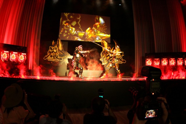 ゲストの中山麻聖さん、水石亜飛夢さんの登場では、ステージ上で黄金戦士の殺陣が披露され、ドラマ・映画さながらの迫力を場内のプレス関係者に魅せ付けた。
