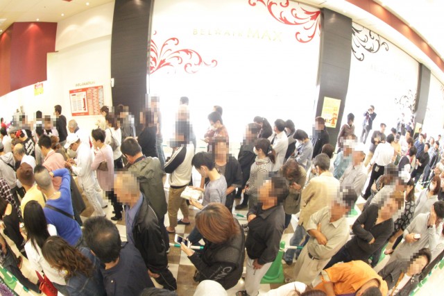 仮面ライダーが44台、牙狼が88台と132台の狭き門に、500人近い人が訪れ望みを託す。 早々に抽選をしても当選するとは限らないので、一喜一憂の人間模様を目の当たりにする。 次々と抽選が行われ、空き台が減少するに従い不安そうに見守る人、人、人。 そうこうするうちに定員になり、残念そうな顔の人、嬉々としている人と第一の関門が幕を閉じた。