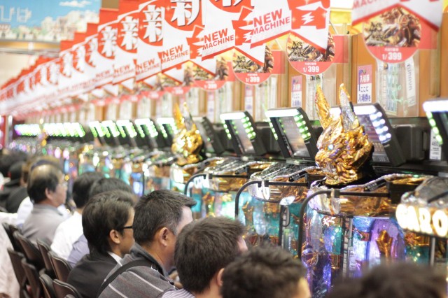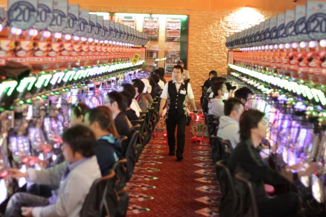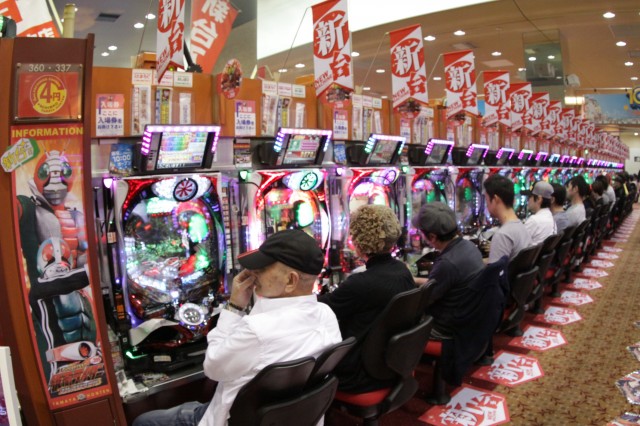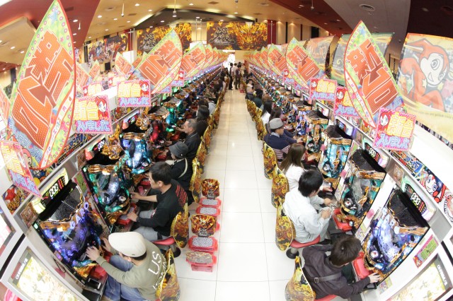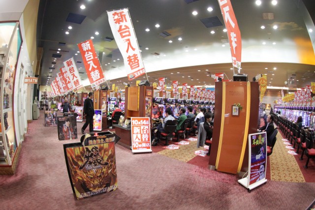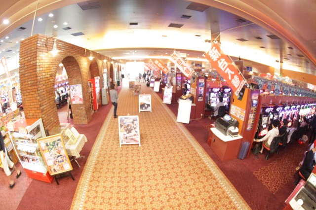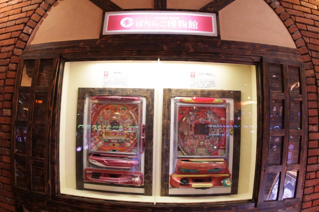 広々とした中央通路を境に、スロットコーナーとパチンココーナーに分かれ、年代物のパチンコ機も展示しており、その歴史の長さ、ファンからの支持の高さが窺える。