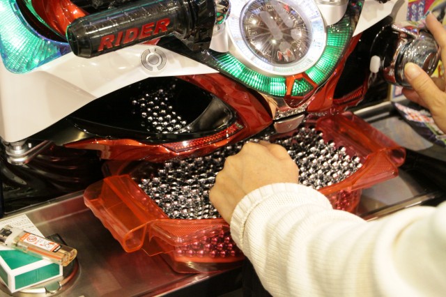 そして、一斉にハンドルを握りスタートチャッカー目指して玉を弾く。 今回の『ぱちんこ仮面ライダーフルスロットル』はいわゆるパチンコ新基準を目前とした最後の旧基準MAX機。 大当たり確率は1/399で、STはV入賞タイプ150回のロングST、確変突入率は約55%、継続率が約83%、そして16Rは約80%という堂々たるスペック。 台を見るや否や、その目に飛び込むのはライダーのバイクを模したバーハンドルに円形のメーターパネルという専用筐体。 実際、プライベートでもバイクを乗る著者としては、パチンコでバイクをここまで表現したメーカーの意気込みが伝わる。