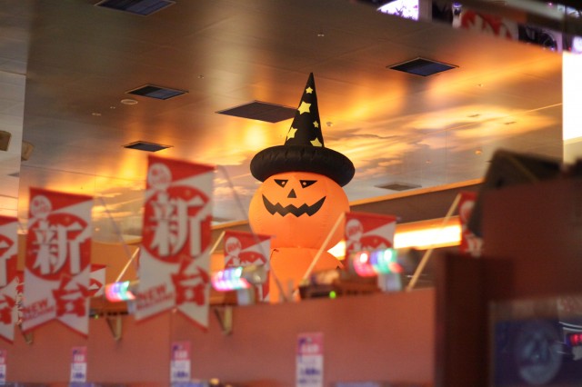 店内・休憩スペースにはハロウィンの装飾が飾られ、新台入れ替えの幟が島上にそびえ立つ。
