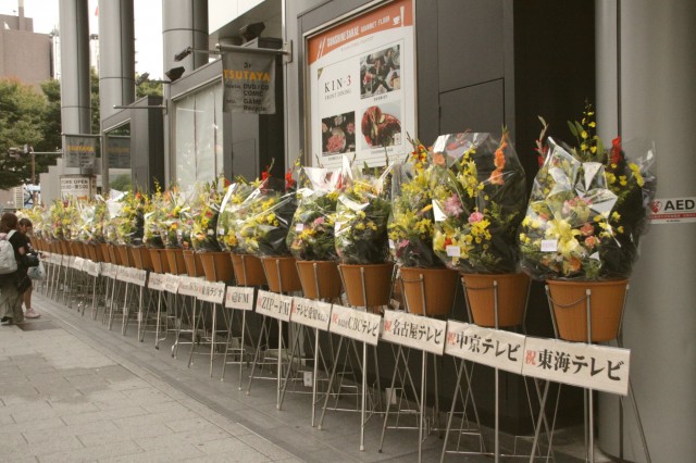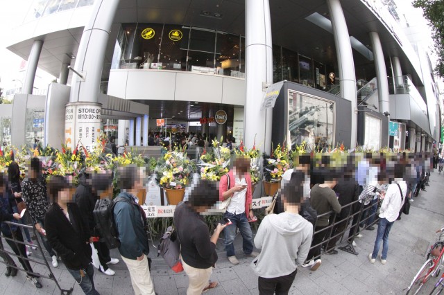 店舗の周りには、フラワースタンドが包み込むように取り巻き、更にその外を多くのファンが並んで待つ。