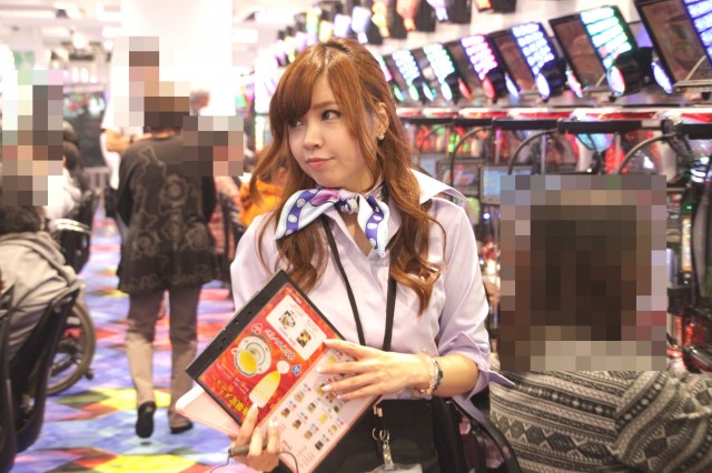 パチンコ島には珍しく、クッション性の高い前衛的デザインのカーペットが設えられており、島端のサイネージによるインフォメーションもバッチリだ。