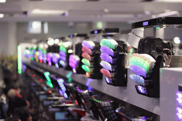当然、各台計数機なので玉積みこそはないが、幕板にそびえる出玉表示ランプがどれもレインボーに輝きそそり立つ。