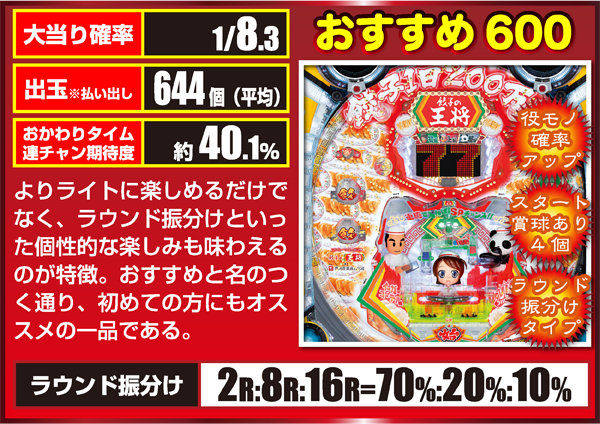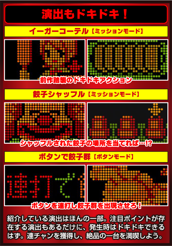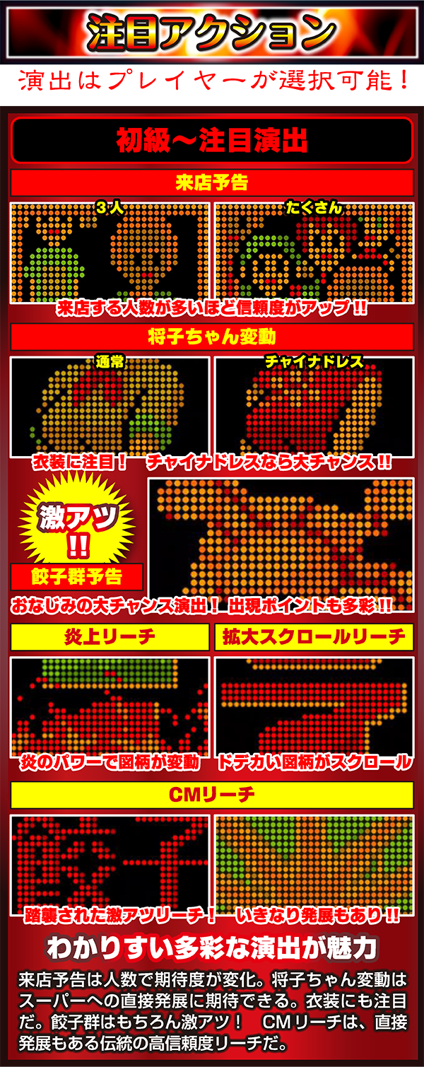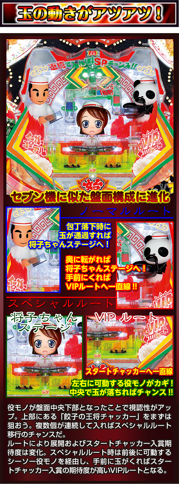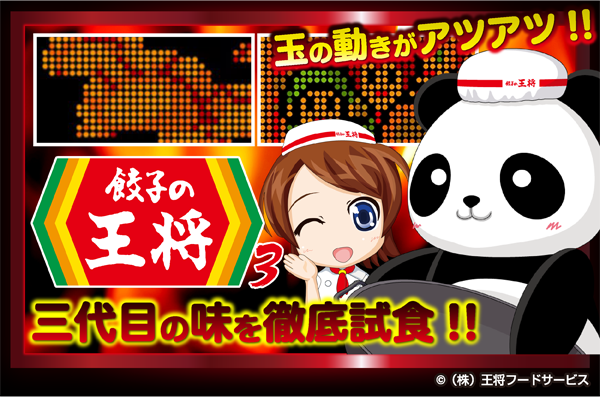 豊丸から登場する「CR餃子の王将3」は、今までのシリーズ以上に玉の動きといったアナログな興奮を堪能できる1台である。もちろん、ドット演出も継承・進化。新しい興奮を味わえることだろう。