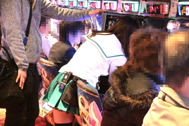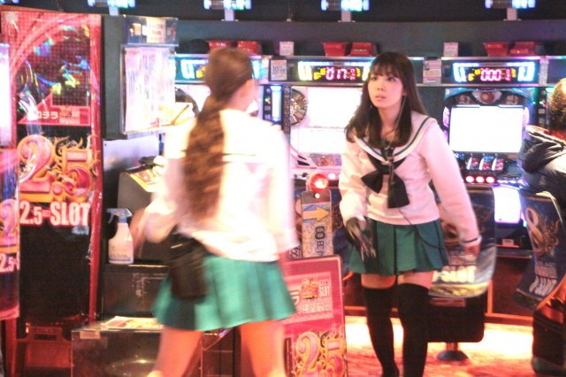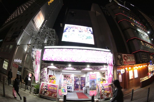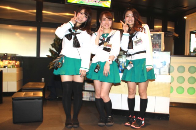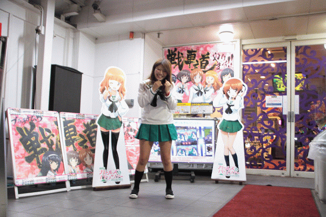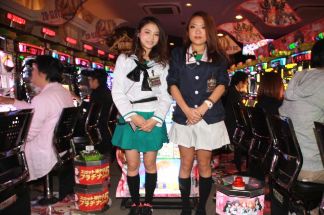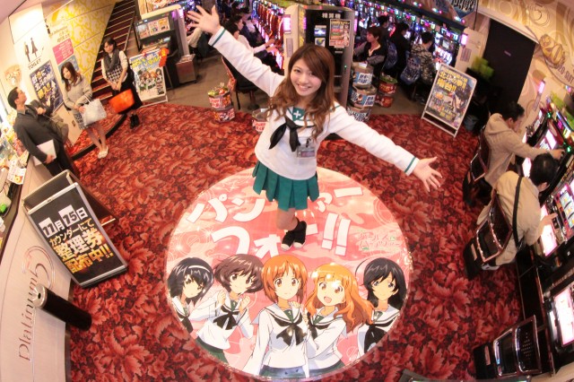 市岡店よりやや赤みの入ったビビットヴァイオレットの装飾に、店舗前には最新台の『ガールズ&パンツァー』のコスプレでお出迎えしてくれる!!ヒャッハー!!