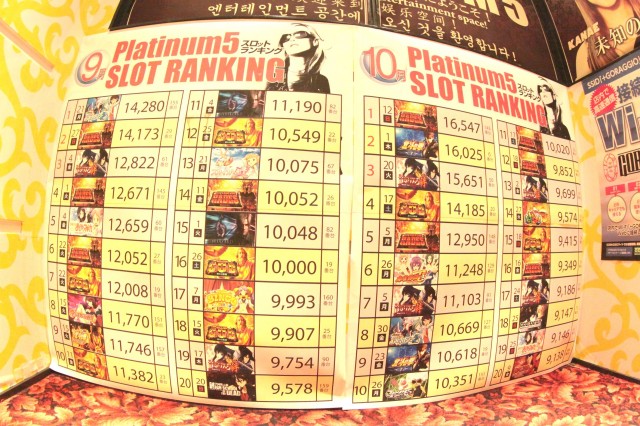 平日の18時前だというのに、全体稼働は良好。中でも最新台の『ガールズ&パンツァー』は満席で、別積みが見る見る出来上がる。更に『バジリスク-絆』『北斗の拳強敵』『ミリオンGOD神々の凱旋』に『ジャグラー』シリーズも元気いっぱい!そして階段の踊り場には、9、10月の優秀台が一覧に掲示してあり、万枚超えがギッシリ記載!
