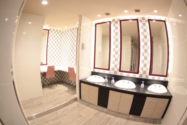 禁断の女子トイレには洗面台と別に、化粧直し用のパウダースペースが設置されていて、オシャレにうるさいご婦人方も納得してくれることだろう。
