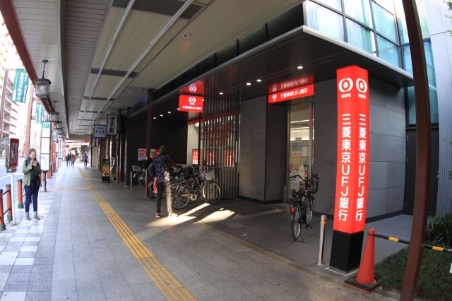 すると東京メトロ銀座線、都営浅草線の「浅草」駅出入り口も見えてくる。そして、そのまま「浅草寺」方面に「雷門通り」を歩くと右手に「雷門」を見ることが出来るので、そのままさらに上野方面へ向かい「東京三菱UFJ銀行」、「オレンジ通り」を右手に見ながら、直進。