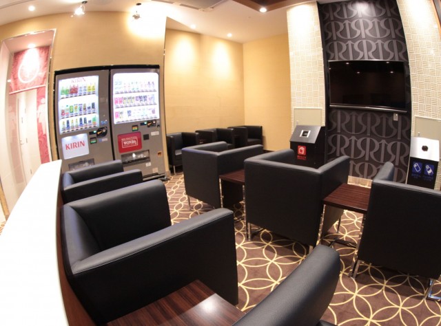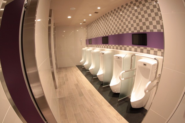 そして、エントランス横には、通りに面して大型LEDビジョン、エスカレーターにもLEDのサイネージが配されており、また、革張りのソファが用意された大型の休憩スペース、男子トイレにもサイネージ等のインフォメーションが誂えている。