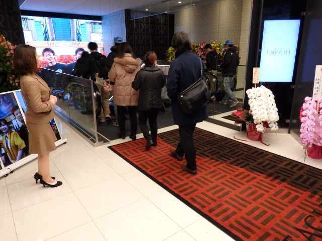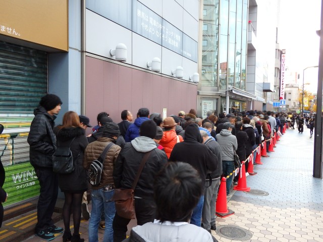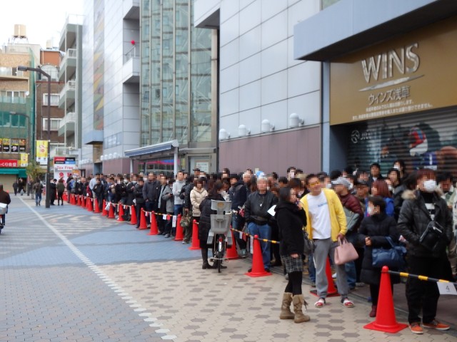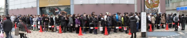 じゃあ、おそらく各ブロック同数はいたであろう、その前のAからDのファンたちはどこに……? 並びの誘導整理をしているスタッフに伺うと、「少しずつ入場していただいて、台選びをしていただいてます」とのお答え。外にいるEブロックのファンだけで数百人はいます。嗚呼、パノラマで撮っても入りきらない!!