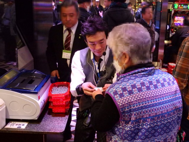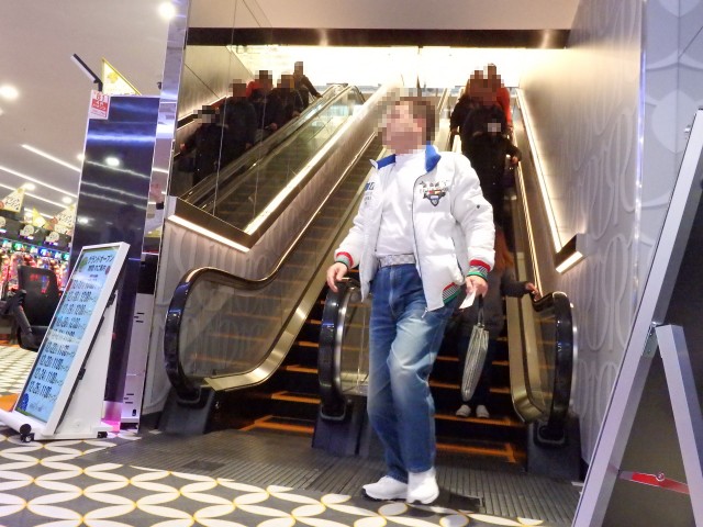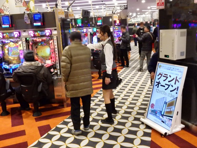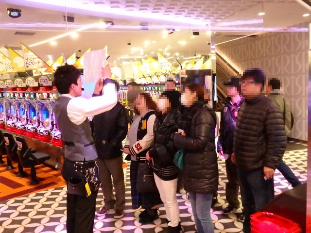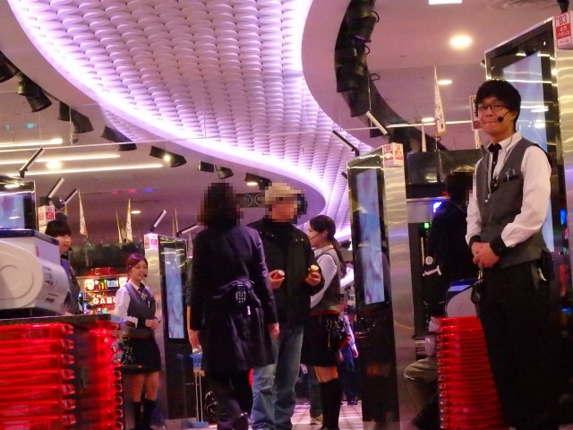 そして、エスカレーターを下った先では、入店直後のファンがスタッフから説明を受けていました。これがまた、親切丁寧で好感度大! 打ちたい機種の設置場所を尋ねる年配の方などには、そこまできちんと案内されてました。