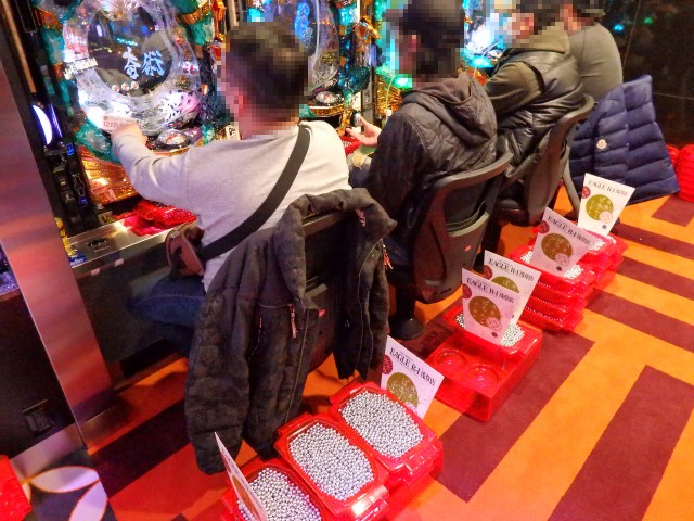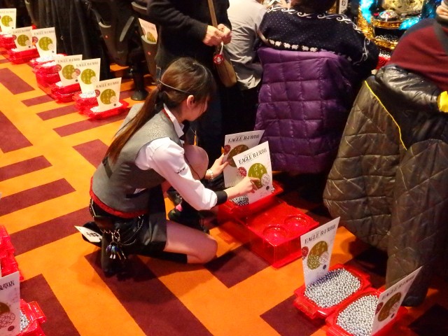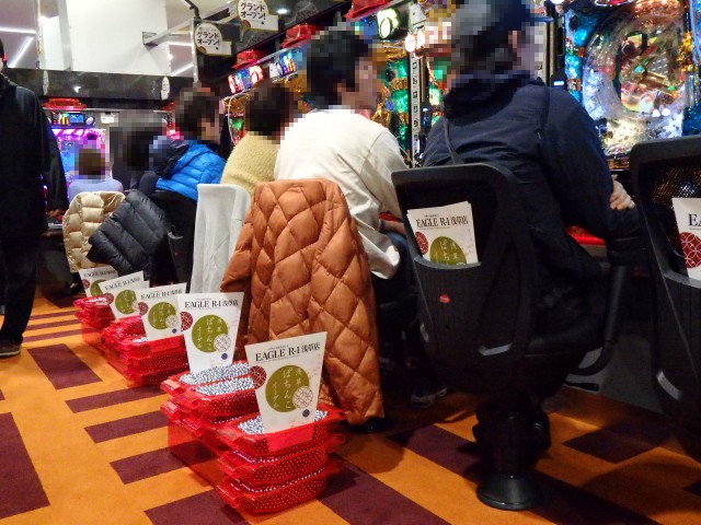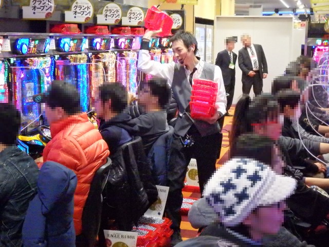 そして迎えた運命の時刻、午後1時。店長の「浅草にイーグルR-1があって良かったと思われるお店にしたい!」という力強い宣言からオープンの号令がかかると、一斉に全台が遊技スタート!! ものの数分で大当りを射止める幸運の持ち主があちこちに現れ、パチンココーナーには瞬く間にドル箱が積まれていきます。