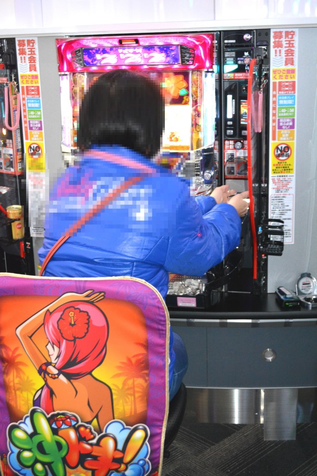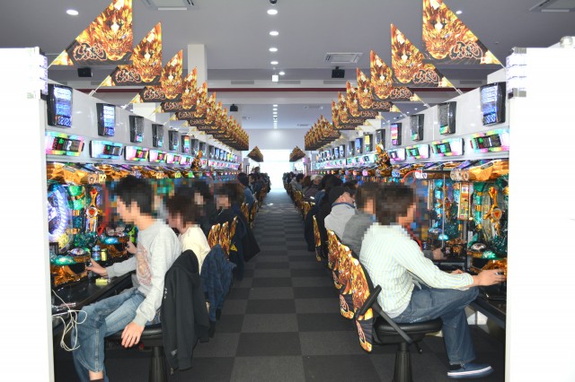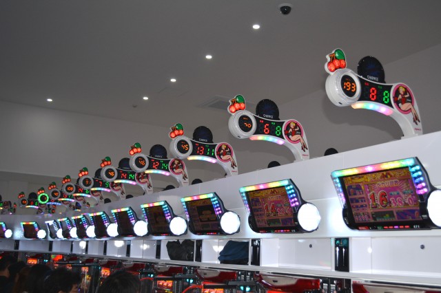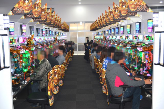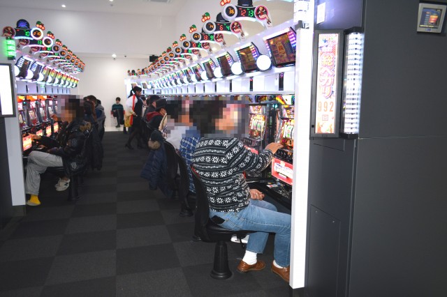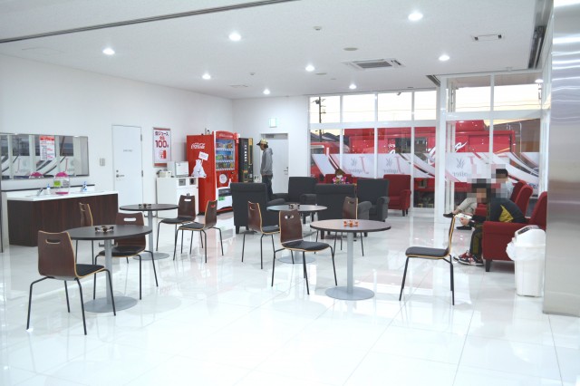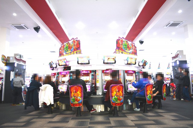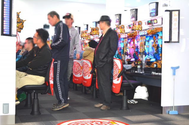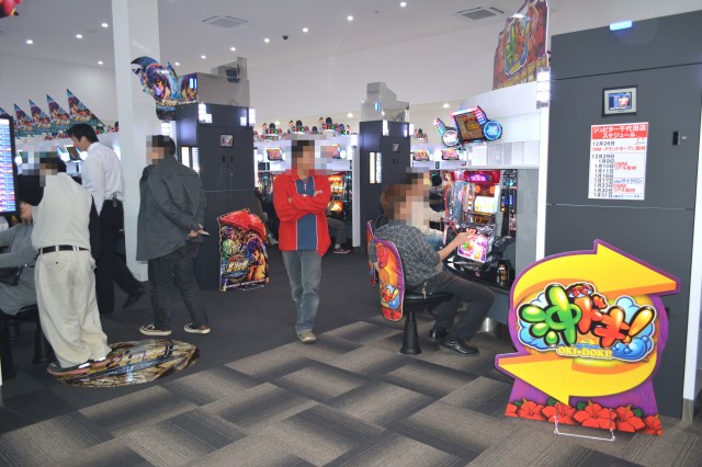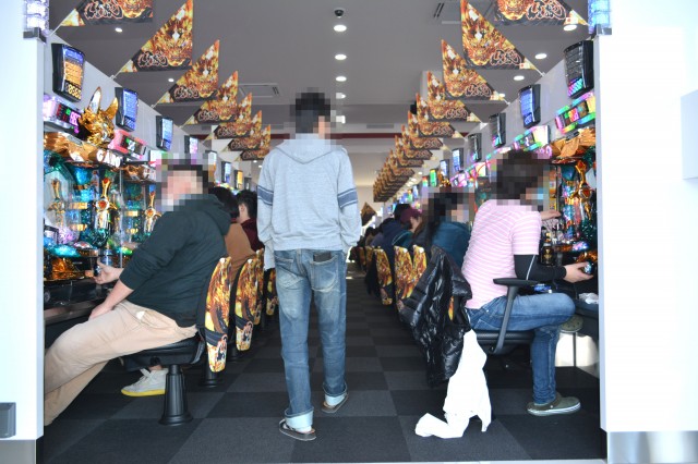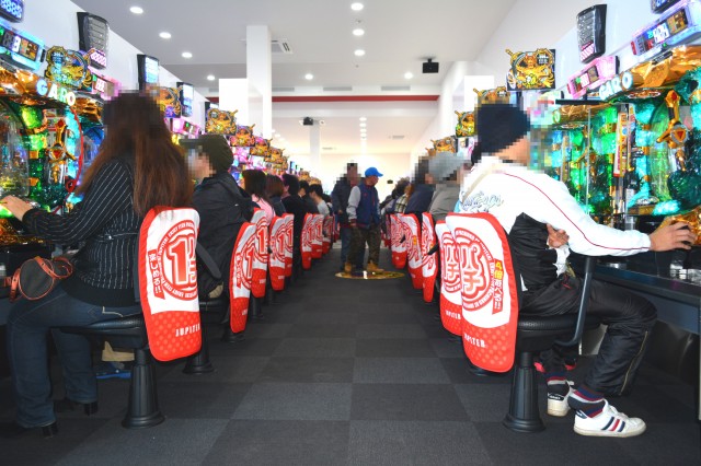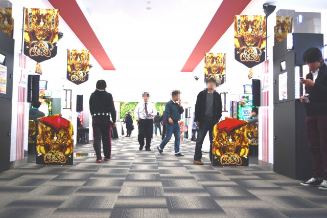 繰り返すが、まだ開店時間から数時間しか経過していない。こうなってはもはや、取材などどうでもよい!写真など撮っている場合ではないのだ! …あまりの事態に理性を失い、ついカメラを置いて勝負に走りたい気持ちをこらえつつ通路を振り返ると、満足そうに帰るファンと台が開くのを待つファンが行き交う。広々と居心地のよさそうな休憩コーナーも、今のところ出番はなさそうだ。