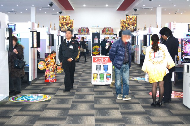 同店の設置台数はパチンコ320台にパチスロ230台。もはや空いている台など皆無のはずだが、じっと車中で待つファンたち。運ちゃんによると、住宅街に近いこの周辺は、有力店が何店舗も新規出店する超激戦区なんだとか。各店の状況に合わせて店巡りをするなど、レベルの高いファンも多い。当然、同店に対する期待度も相当に高く、グランドオープン当日は、店内はフル稼働のうえ、道路も大変な混雑ぶりだったようだ。そんな“ジュピター渋滞”を潜り抜け、なんとか店内へ。元気なスタッフのお出迎えに心がやわらぐ。