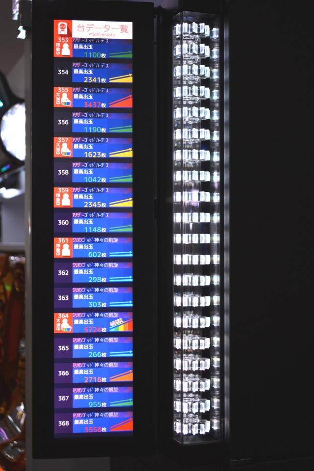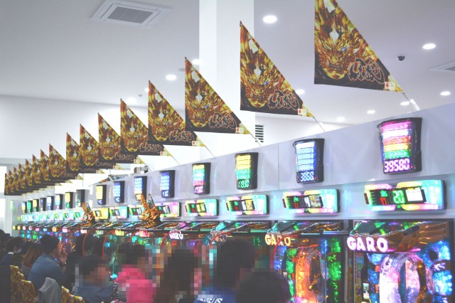 パチンコの持ち球数は玉箱ランプの色で判別できるようになっていて、かなり離れた場所からでも状況が一目で丸わかりだ。注目はエリア内でもトップクラスの設置があるという『CRガロ魔戒ノ花』コーナー。状況はどうかというと…このとおり、開店数時間にしてすでにレインボーに輝く台が何台も!! ファンの顔も満足で輝く♪