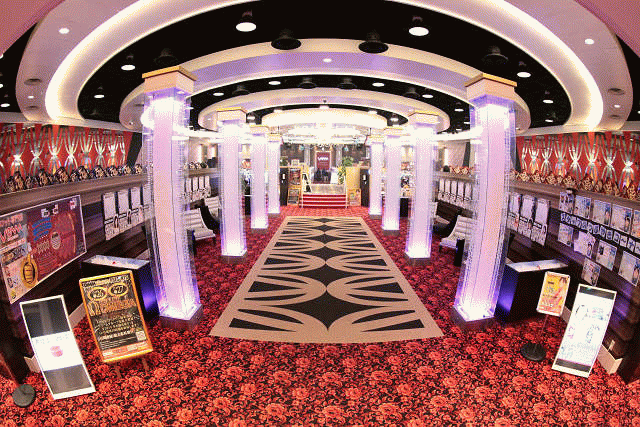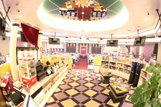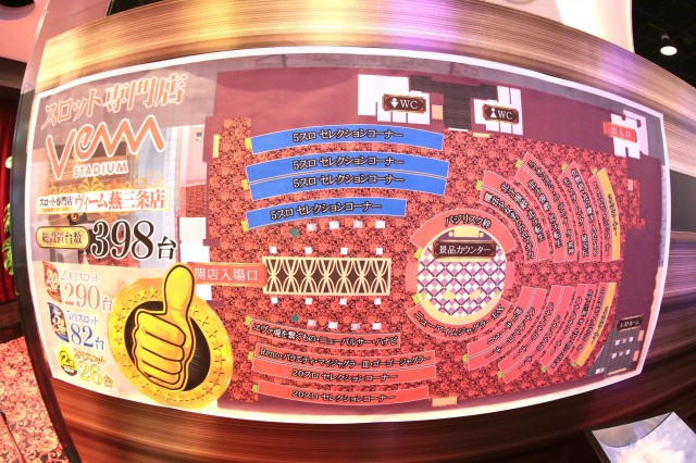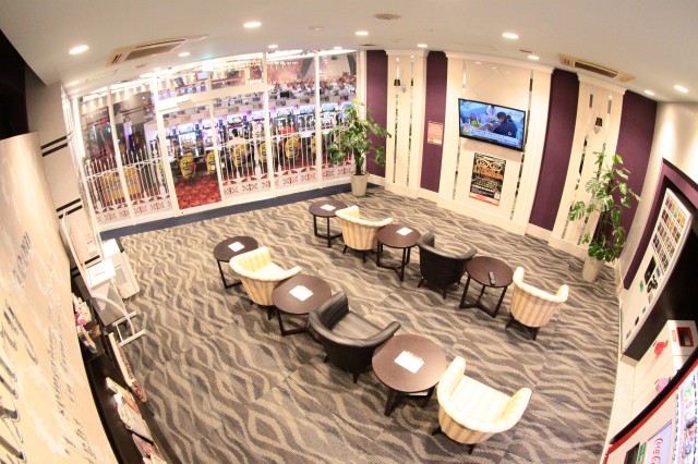 パっと見の外観は、先程の長岡川崎店よりこぢんまりとしているが、ドアを開けるとそこには『ミリオンゴッド-神々の凱旋-』『聖闘士星矢 女神聖戦』を思わせるような神殿、はたまたコロシアムのような豪奢なオープンスペースが広がる。