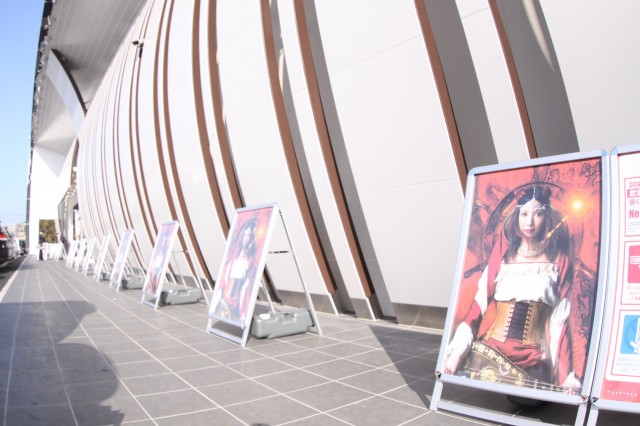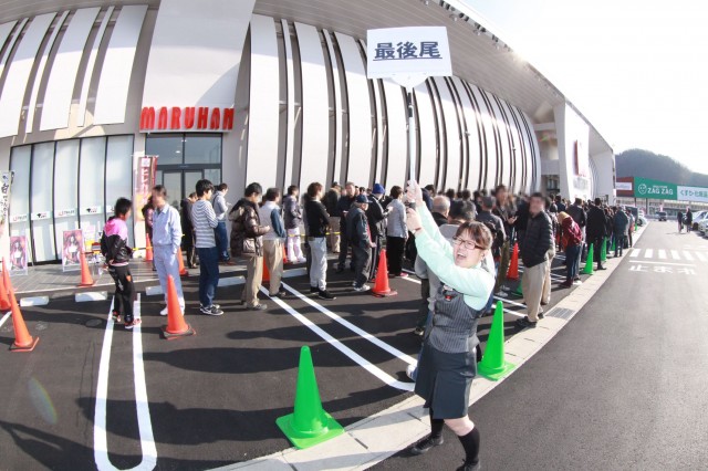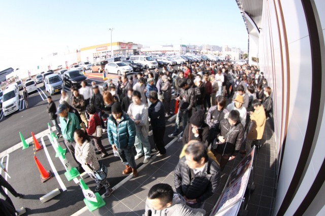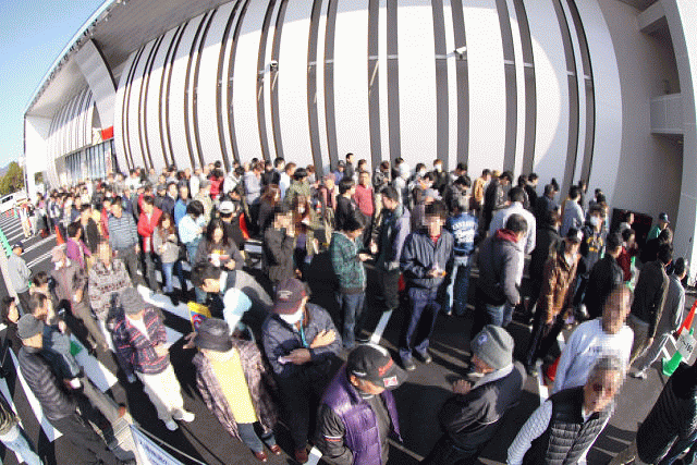 スタッフぅが最後尾の札を青空に高々と掲げ、ファンが集まる集まる。