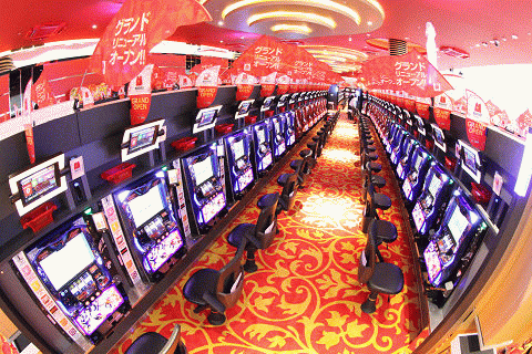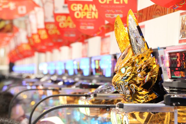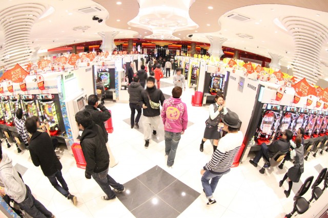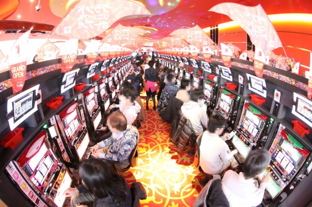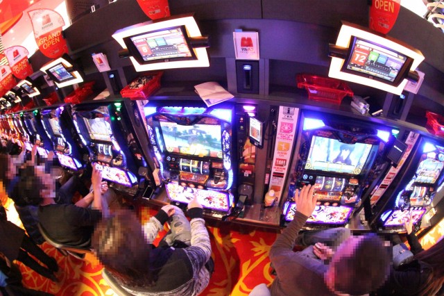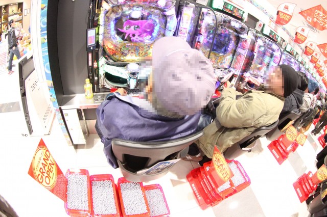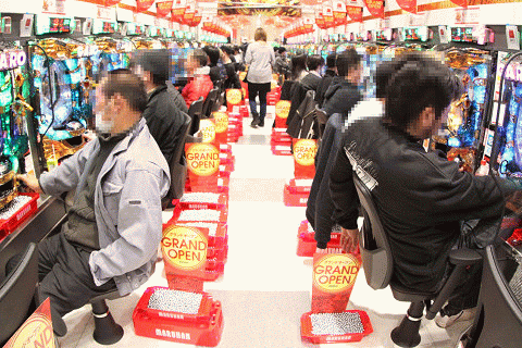 クラッカーの景気の良い音と硝煙の余韻もつかの間、一斉にパチスロのレバーON、ハンドルをひねるファンの熱気に店内は包まれた!