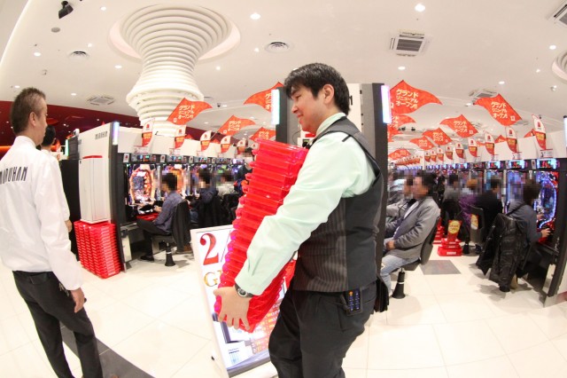 そして、パチンココーナーではスタッフぅが何故か白い箱を大量に店内に運び入れる。