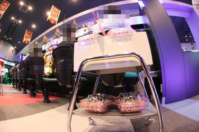 スタッフぅもメダル補給で大わらわ!そして、最大の台数を誇る『ジャグラー』シリーズは、どこもかしこも満員御礼!稼働率