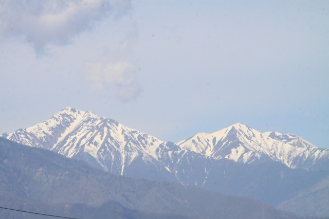 残雪冠る日本アルプスの山々を眺めながら車を走らせる。