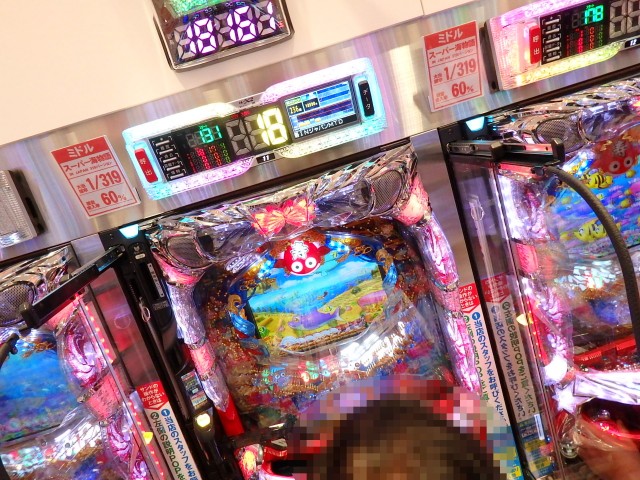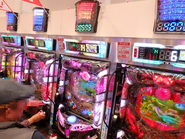こちらは『CRスーパー海物語IN沖縄3』3台と『CRスーパー海物語IN沖縄3 桜マックス』が、4台並んで持ち玉遊技中! お隣をなんとなくライバル視してしまう気持ち、わかります!!