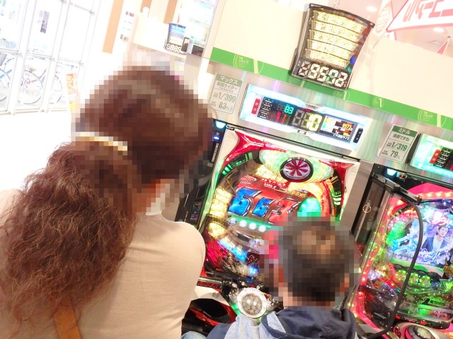 1パチの『CRぱちんこ仮面ライダー フルスロットル RS319ver.』で連チャン中のお父さんを見守るお母さん。「4円パチンコだったら……」なんてヤボは言いっこナシですよ!?