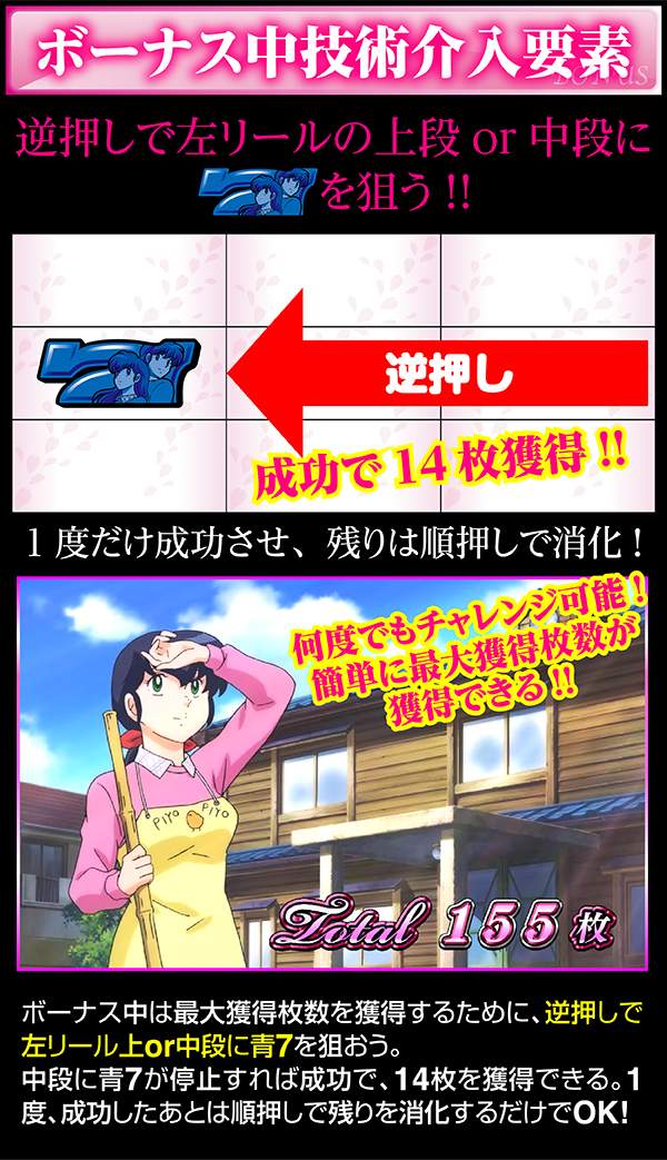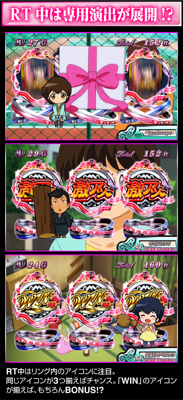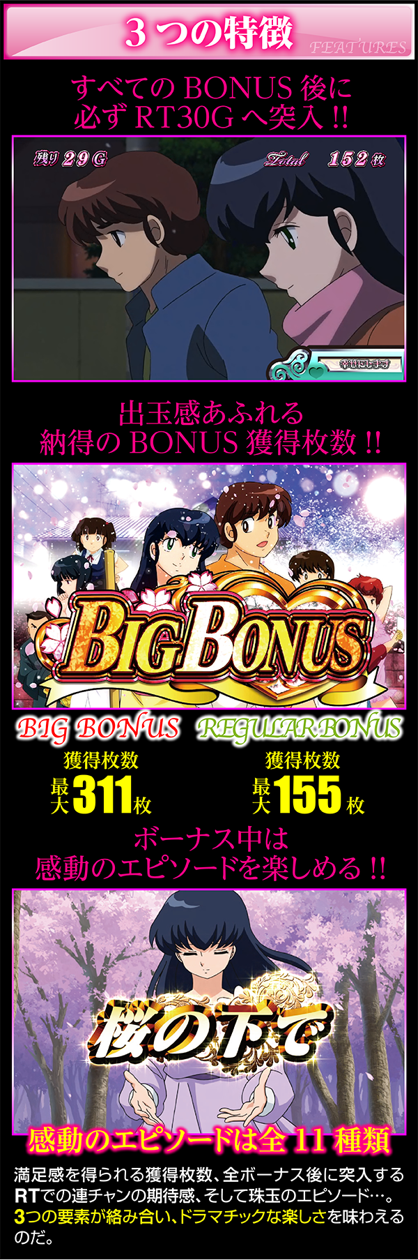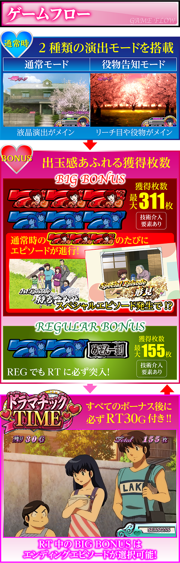 スペックはBONUS+RTとわかりやすく、遊びやすいことが特徴。BONUSの獲得枚数はBIGが最大311枚、REGが最大155枚とボリューム満点だ。30GのRTは、すべてのBONUS後に必ず突入。BONUSとRTの連鎖により、出玉という名の恋をつむいでいく仕様となっている。