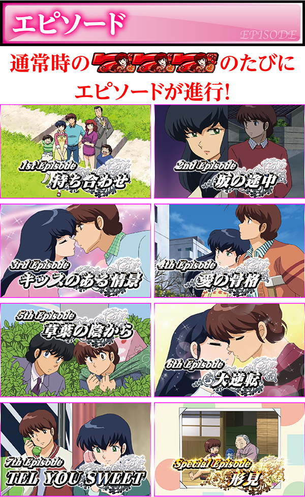 BIG BONUS中に見られるエピソードは全11種類。通常時の赤7BIG獲得を契機にエピソードが進行。スペシャルエピソードとなる「形見」は、7thエピソードの次にみられるわけではなく、出現条件に秘密が…!?