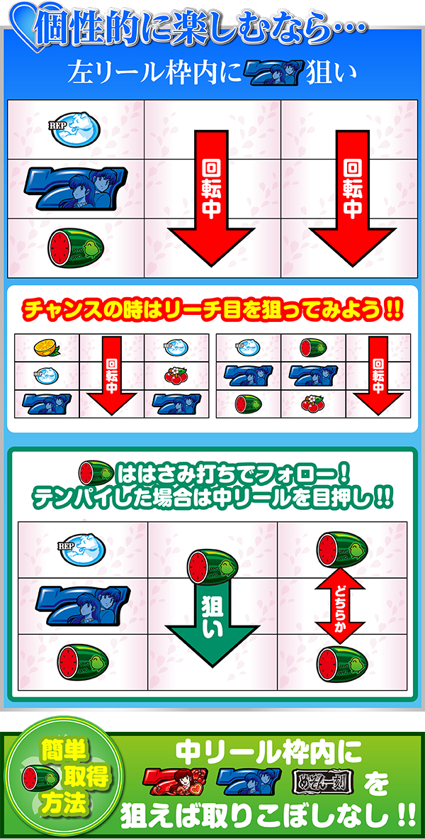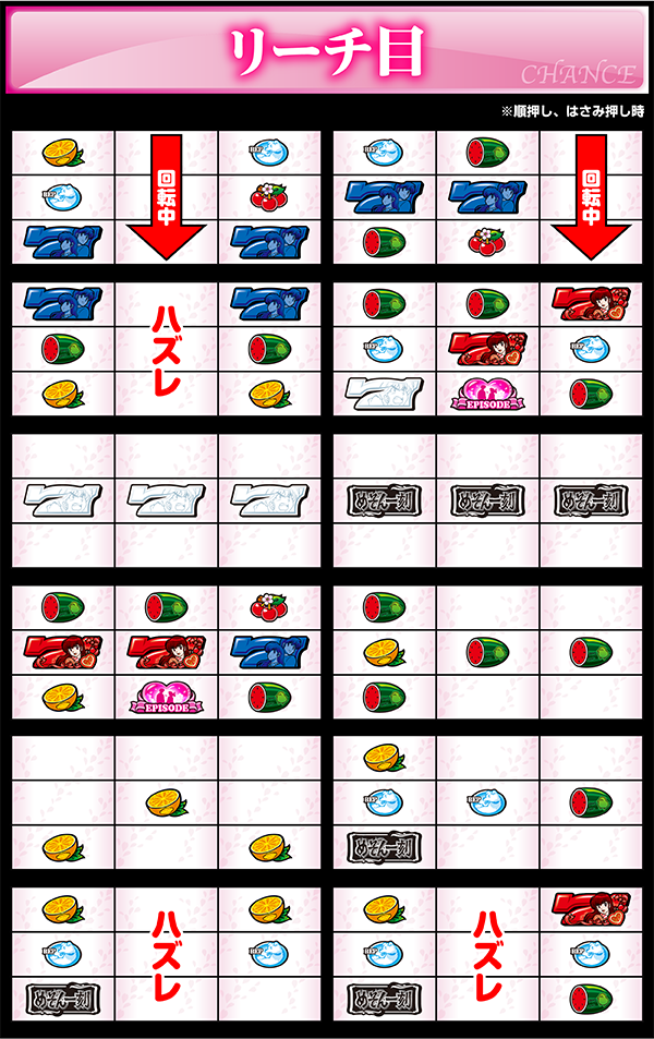 取りこぼしがある小役はチェリーとスイカのみとなっている。スイカは15枚役だけに、取りこぼしには注意しよう。