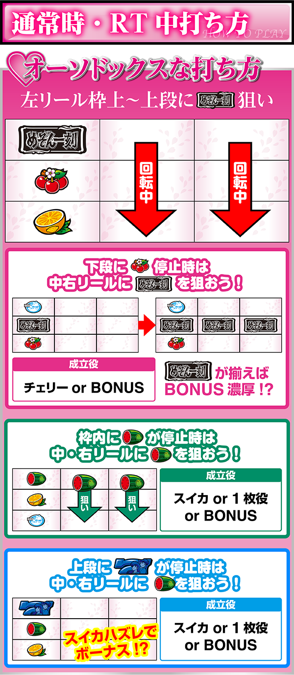 通常時は2つの遊技モードからゲーム性をプレイヤーが選択可能。液晶演出を楽しむか…出目や役物を楽しむか…好みにあわせて選択しよう。 BONUS中は技術介入要素もあるので、最大獲得枚数を目指してチャレンジしよう(手順は下記を参照)。 ゲームフローは単純明快。すべてのボーナス後に30GのRTが付くことがポイントとなっている。
