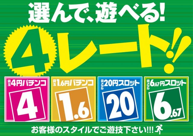 新たに設定された1.6円、こちらもバラエティ色豊かだが『CR牙狼 魔戒ノ花』『ぱちんこCR北斗無双』や定番の『海物語』シリーズもしっかり用意されている。 何より、1.6円パチンコの貯玉で4円も遊べるので、その日の気分によってレートを自由自在に変えることも可能!