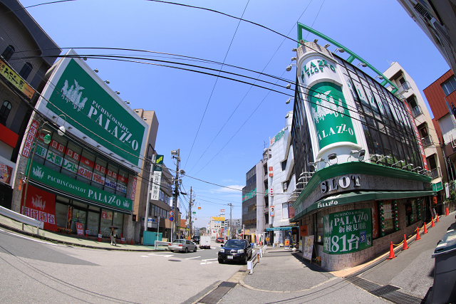 右がスロット館、左がパチンコ館。パチンコ館の2Fには広大なレストスペースが!
