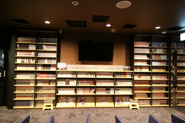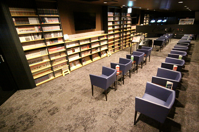 大型のレストスペースには漫画本や雑誌も多数用意され、遊技空間とはセパレートされているので、ゆったりとリラックスもできる。