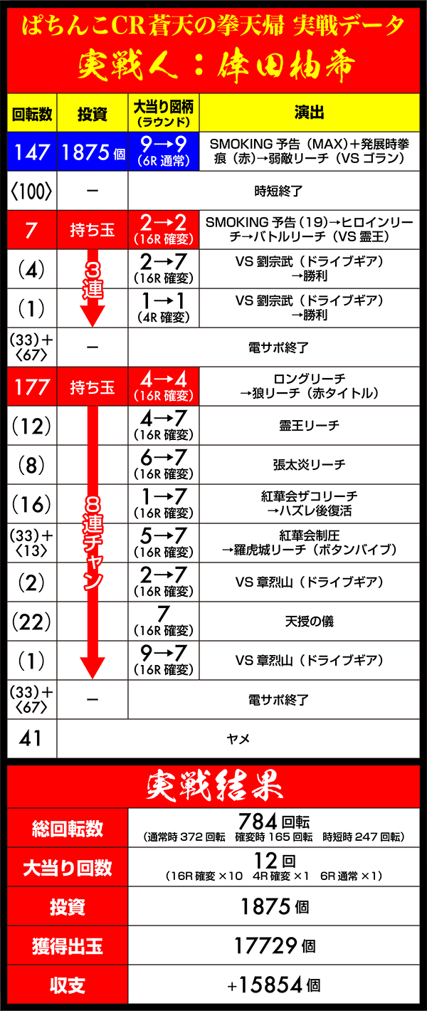 柚希は「初当りの軽さ」、土下座右衛門は「一撃の出玉力」と、それぞれ『ぱちんこCR蒼天の拳天帰』の長所を生かし切れたのが勝因でしょう。