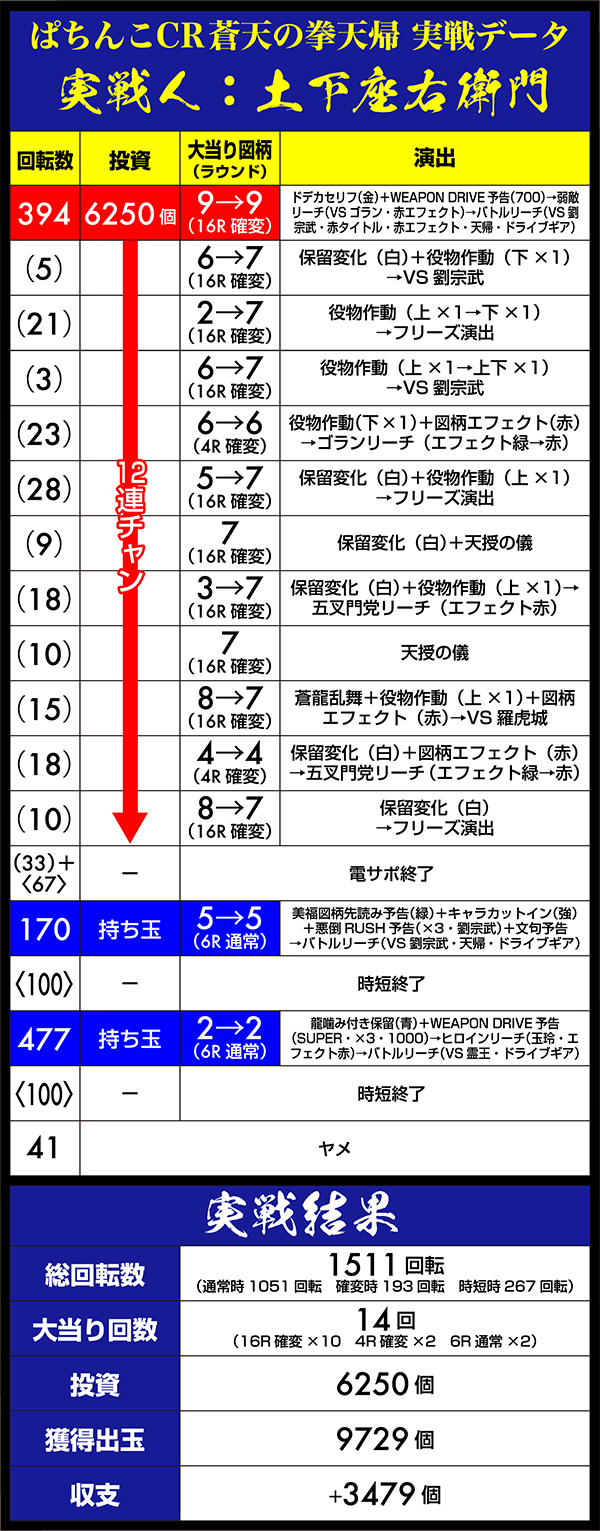 最後に、今回の実戦データを掲載します。大当りパターンなど、ぜひ参考にしてみてください。