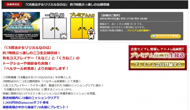9月2日(金)に三洋物産・三洋販売が、「ベルサール秋葉原」で、同社製新機種『CRリリカルなのは』の公開収録を行う。