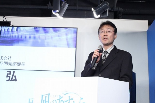 ポイントである「凪のあすから(以下、凪あす)」とのタイアップについて説明。今日までの経緯については、一人の開発スタッフの熱意が最初のトリガーになっていると明かした上で、本機の持ち味や原作の魅力を引き出す様々な仕掛けを紹介した。