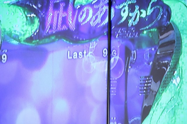 | BIG後のRTは前期・後期の2段方式。前期のRT中に告知音(&右上のゲーム数に泡エフェクト)が発生したタイミングが後期RT突入のチャンス。逆押しで左リールに三連7図柄を停止させれば成功となる。いかにギリギリで突入させるかが勝負の分かれ目となる。なお、突入チャンスは入賞ボーナスによって難易度が変化。左リールの三連7図柄の引き込みが異なり、青7なら5コマ(イージー)、赤7なら2コマ(ノーマル)、黄7はビタ押し(ハード)となっている。 | |