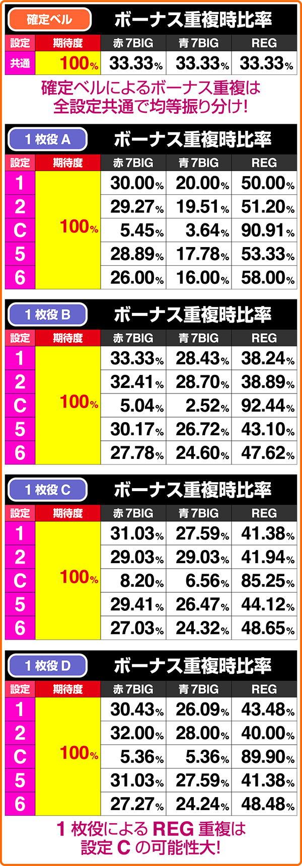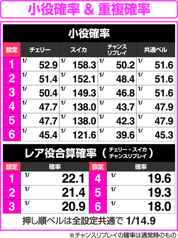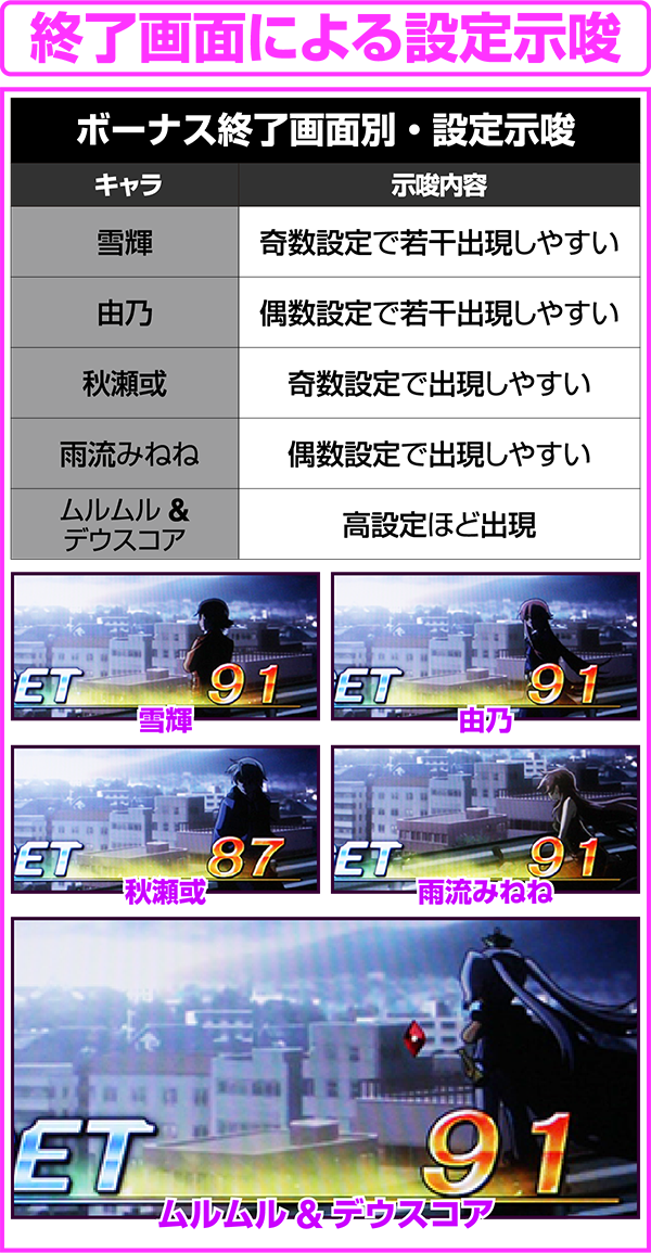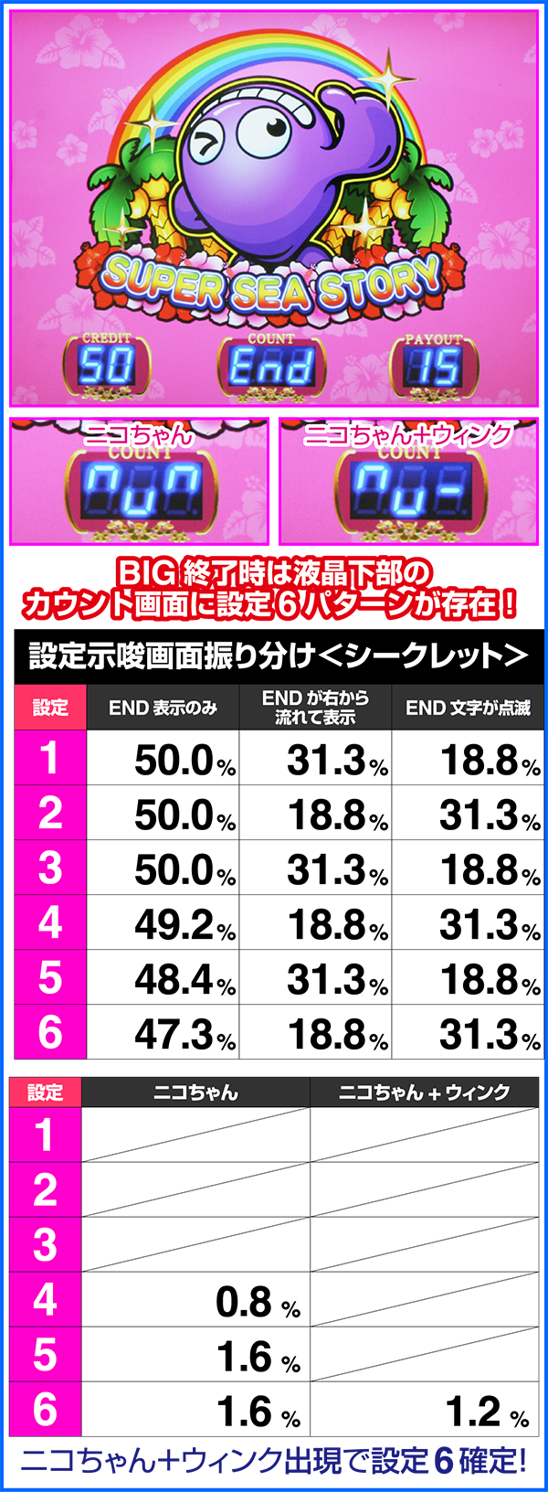 シークレットモード中のBIG終了後のみ設定6確定画面が存在。設定示唆画面である「ニコちゃん」や「ニコちゃん+ウィンク」は液晶下部に表示されているカウント内に出現するので、終了後は必ずチェックしよう。