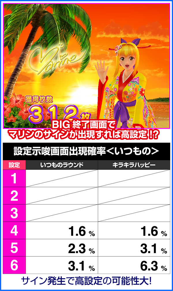 いつものラウンドを選択した際に出現する可能性がある設定示唆。サイン出現時は設定4以上が確定する。また、前回のBIGから100G以内にBIGに当選した際は、楽曲がキラキラハッピー中になり、サインの出現確率も変化する。