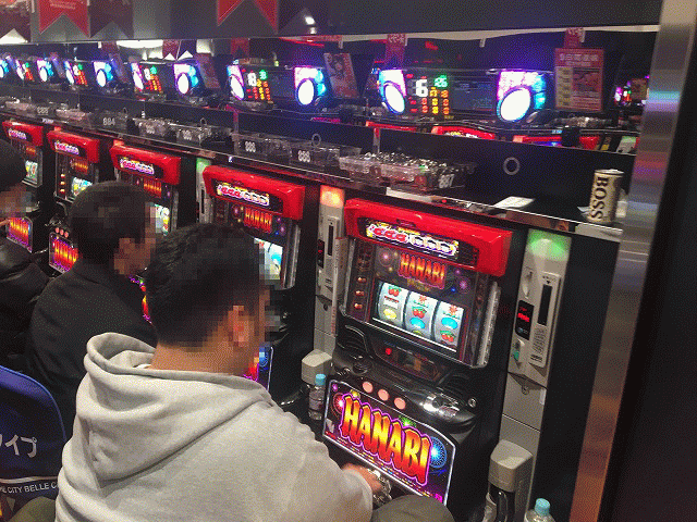 まずは「ハナビ」から。Aタイプなので、とんでもない箱積みはないものの、先頭の角台をはじめ、どの台もいい感じに出玉を獲得していた。やはり、ドンちゃん来店パワーかなと思いつつ、背後を振り返ると・・・