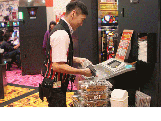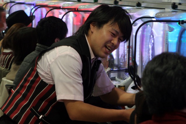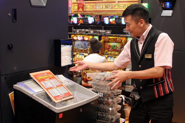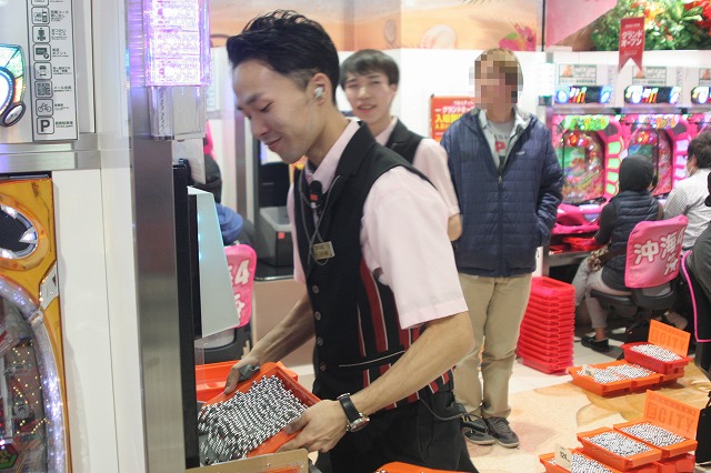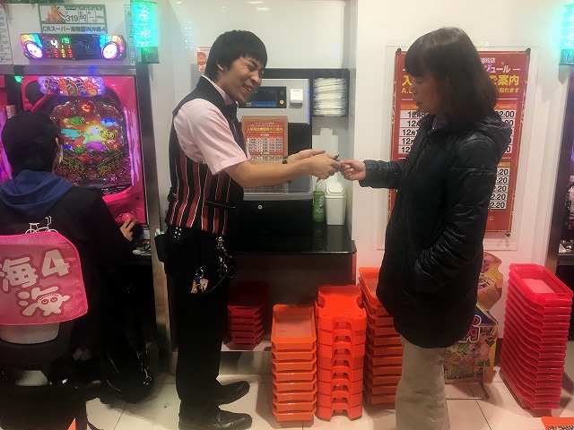 さて出玉チェックは、後のお楽しみにとっておくとして、まずはスタッフの働きっぷりからご紹介しよう。既にこれまでの営業で常連客との信頼関係が醸成されているのか、一様にフレンドリーだ。常に笑顔を心掛けた接客は、見ていて清々しい。