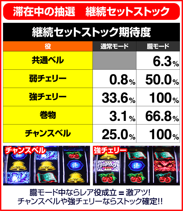 追想の刻はセット数開始時に毎回継続ゲーム数と朧モードを抽選。継続ゲーム数は基本的に10Gがメインとなり、20G以上だった場合は追想の刻の最終ゲームでゲーム数が加算される。この継続ゲーム数が合計40Gだった場合は設定6確定。