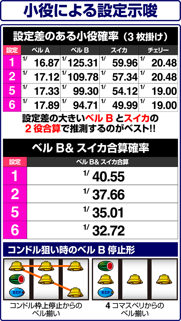 リプレイ以外の全役に設定差が存在。推測の軸となるのは設定差の大きいベルBとスイカなので、推測時は2役を合算して数値を確認するのがベストだ。