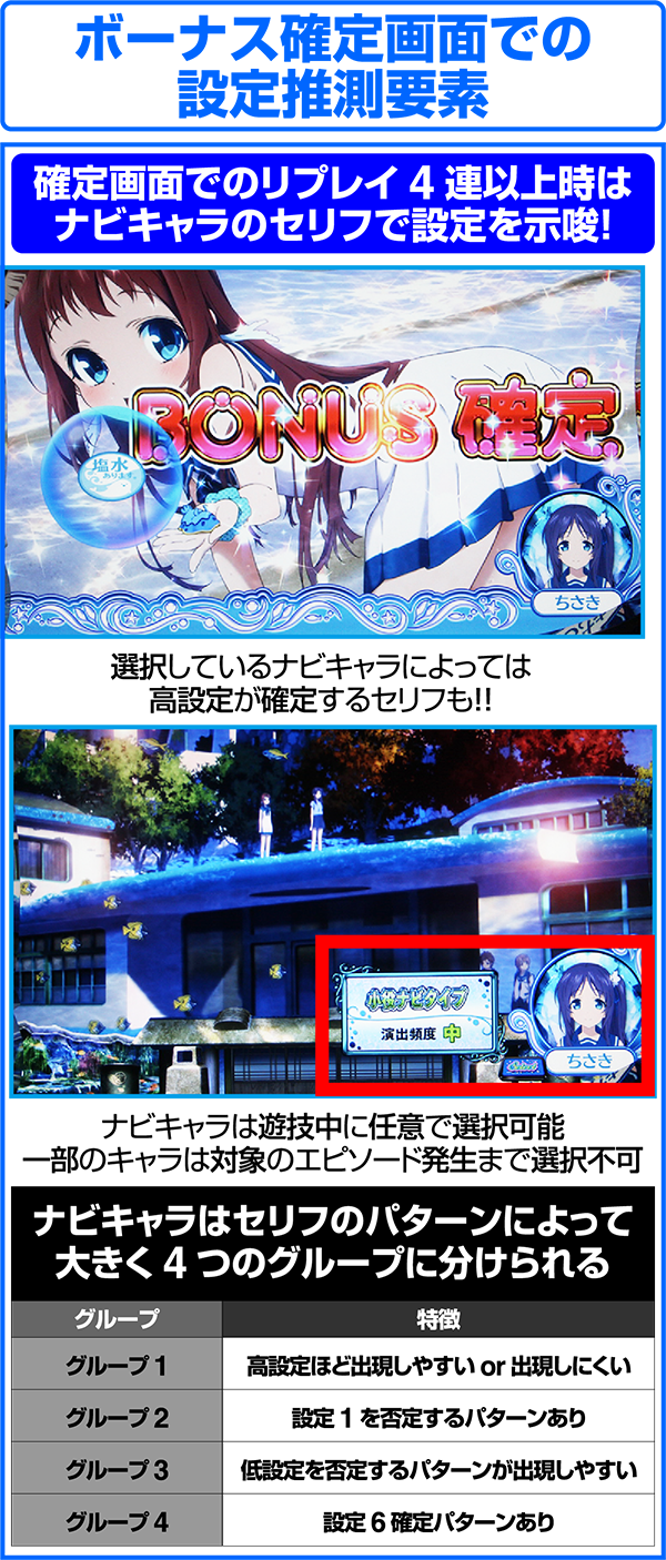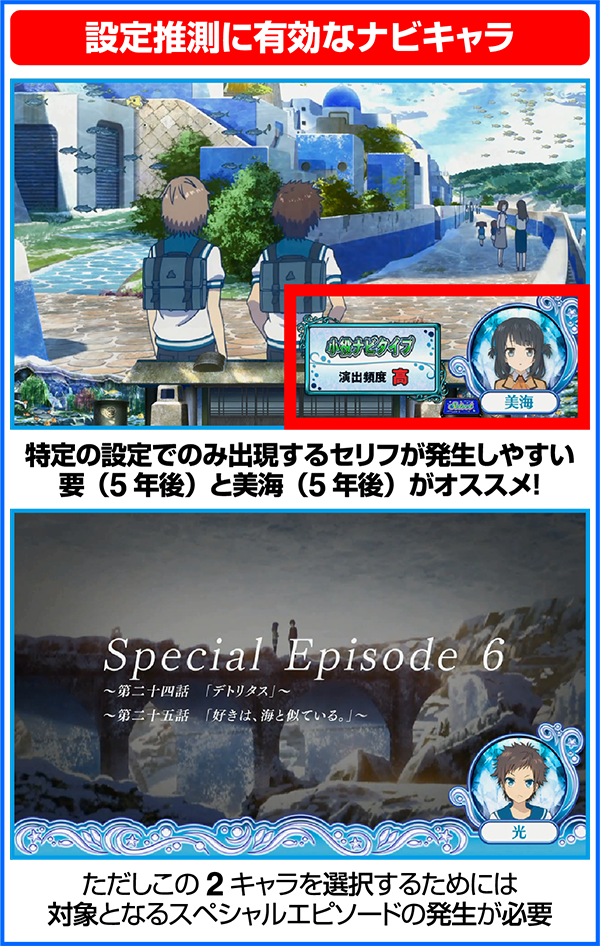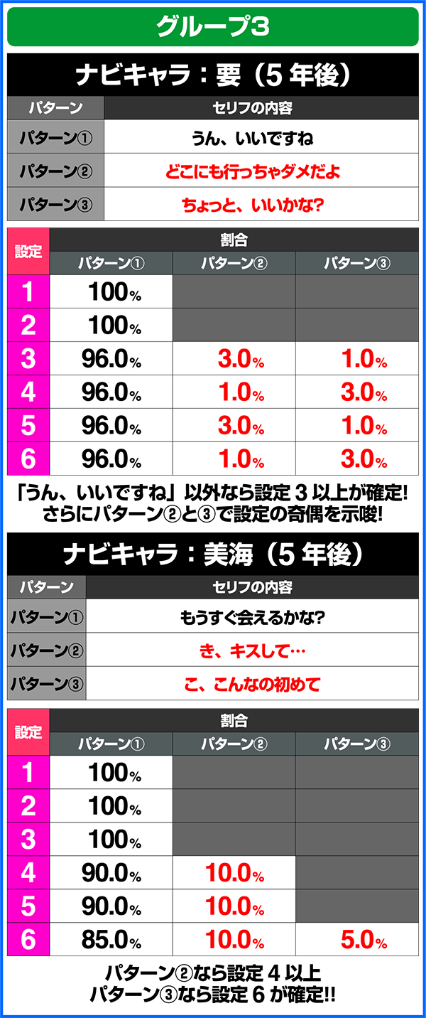 要(5年後)と美海(5年後)は低設定を否定するパターンが出現しやすいため、高設定を狙う際はこの2キャラを選ぶのが得策と言える。